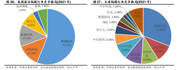 高工产研统计显示:2021年,全球隔膜行业主要企业包括恩捷股份、星源材质、中材科技、旭化成、日本东丽、中兴新材等,其中我国隔膜已具备显著的竞争优势,恩捷股份全球市场占比31%稳居行业第一。我国隔膜行业集中度高,2021年湿法隔膜企业主要包括恩捷股份、中材科技、星源材质和金力股份等,其中恩捷股份市场占比56.10%。