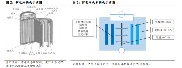 锂电池主要由正极材料、负极材料、电解液、隔膜四种关键材料和辅助材料如容器、正/负极集流体、绝缘片、极耳、安全阀等构成。就成本构成而言:正极材料比重最大,占比一般大于40%,其次是隔膜、负极材料和电解液。