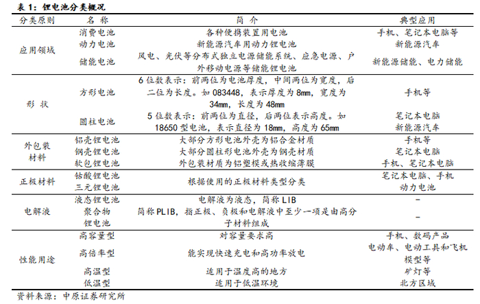 锂电池可根据应用领域、形状、正极材料、电解液、外壳包装材质等进行分类。结合统计惯例和业界习俗,其主要分类方式主要包括:一是根据应用领域分为储能电池、动力电池和消费电池。二是结合形状和外包装材料分为方形锂电池(Prismatic LIB-Pr LIB)、圆柱锂电池(Cylindrical LIB-Cy LIB)和软包锂电池(Pouch LIB)。三是根据正极材料可分为钴酸锂、三元、磷酸铁锂电池。另外,还可以根据电解液以及性能用途进行分类。