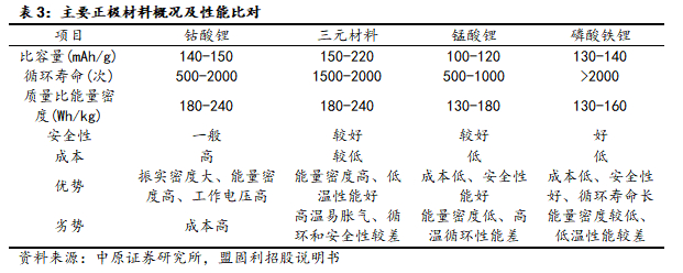 目前,正极材料主要包括钴酸锂、锰酸锂、三元材料和磷酸铁锂,不同正极材料有着不同的性能和优缺点,主要正极材料概况及性能比对如下表所示。