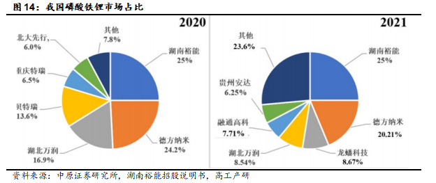 高工产研统计显示:磷酸铁锂正极材料主要企业包括湖南裕能、德方纳米、龙蟠科技、湖北万润、贵州安达等,2021年湖南裕能居行业第一、德方纳米和龙蟠科技分别位居第二和第三。