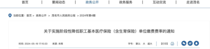 广东省茂名市人民政府此前印发通知,实施阶段性降低职工基本医疗保险(含生育保险)用人单位缴费费率,由原来的7%(含生育保险0.5%)下调至6.5%(含生育保险0.5%),自今年5月1日起执行,实施期限至2025年12月31日。