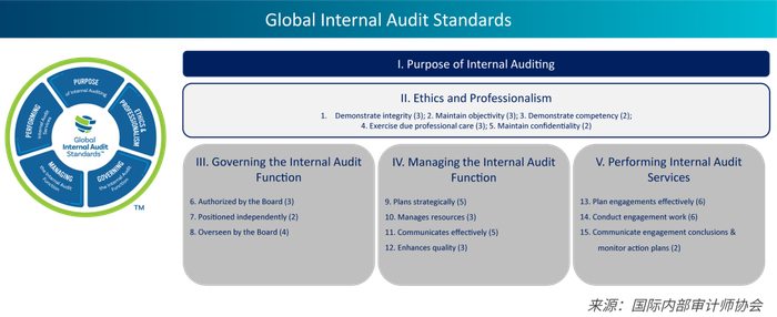 《准则》的核心是15项原则,以促进内部审计有效性。15项原则分布于5个领域,每项原则均有若干标准予以支持,共计53项标准。每项标准包含要求、实施考虑因素、及遵循性证据示例。