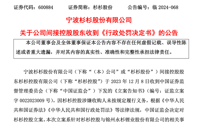 10月26日,杉杉股份(600884)对外披露,公司间接控股股东杉杉控股收到辽宁证监局下发的《行政处罚决定书》。这一处罚决定的背景可追溯至2023年12月8日,当时杉杉控股因涉嫌在收购过程中未按规定履行相关义务,被中国证监会下发《立案告知书》。