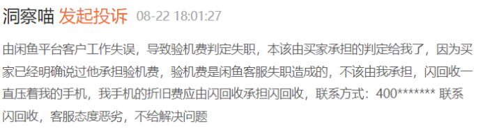 还有消费者表示平台会较长时间留置待验货的手机,其表示“由闲鱼平台客户工作失误,导致验机费判定失职,本该由买家承担的判定给我了,因为买家已经明确说过他承担验机费,验机费是闲鱼客服失职造成的,不该由我承担,闪回收一直压着我的手机,我手机的折旧费应由闪回收承担闪回收,客服态度恶劣,不给解决问题。”