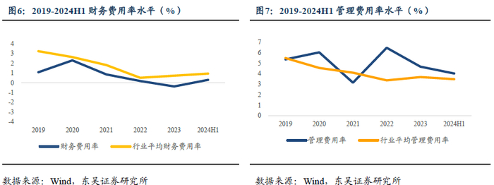 注:图4-7中的行业平均线,均是通过计算申万二级行业指数的各项费用和主营收入的比值,得到相应的费用率,而不是单个公司的相应费用率的加权平均,这种计算方法在行业集中度比较高的时候,可能会突出主营收入较大的公司的影响,弱化主营收入较小的公司的影响。