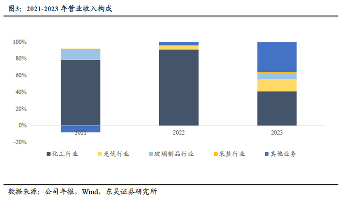 和邦生物营业收入主要来源于化工行业。和邦生物2021-2023年化工行业业务收入占主营业务收入比重分别为93.38%、90.82%和40.80%,同时产品结构年际调整,其他业务规模不断扩大,光伏行业业务占比不断上升。