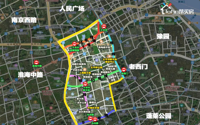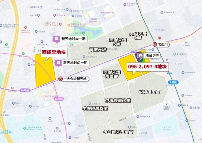 含着金汤匙出身的法藏讲寺地块,位于黄浦区中部、淮海中路街道东侧,靠近老西门街道和豫园街道,紧靠地铁 8、10 号线老西门站。