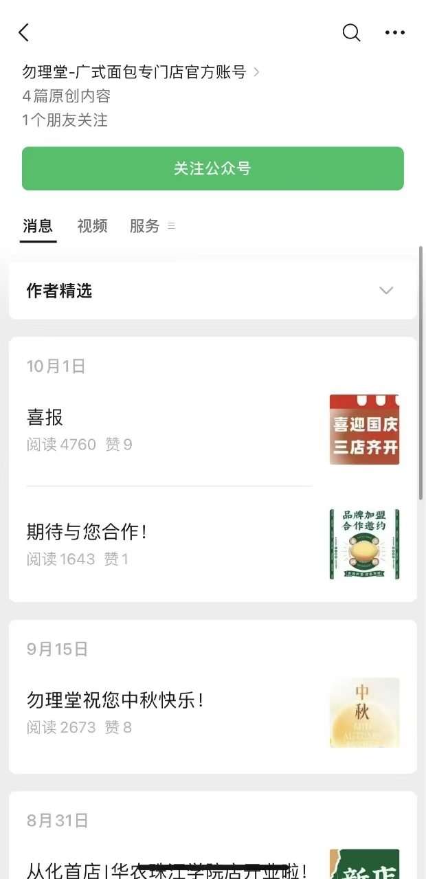 记者注意到,在“勿理堂”微信公众号上,最新的一条推文发表于今年10月1日,推文内容显示,国庆期间勿理堂还分别在佛山和台山两地新开了三家门店,同时在次条推文中发布了“品牌加盟,合作邀约”的信息。