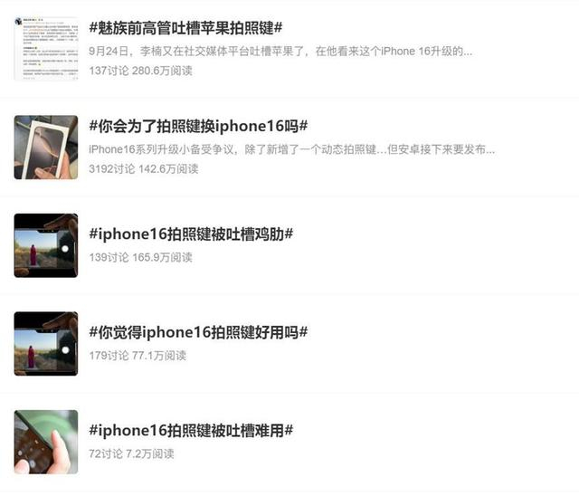 把五个功能集成在一个按钮上,这对于第一次上手的用户来说,还是需要很大的学习成本的,以致于 iPhone 16 系列开售当天,数个有关 iPhone 16 拍照按钮难用的话题登上热搜。