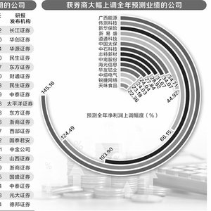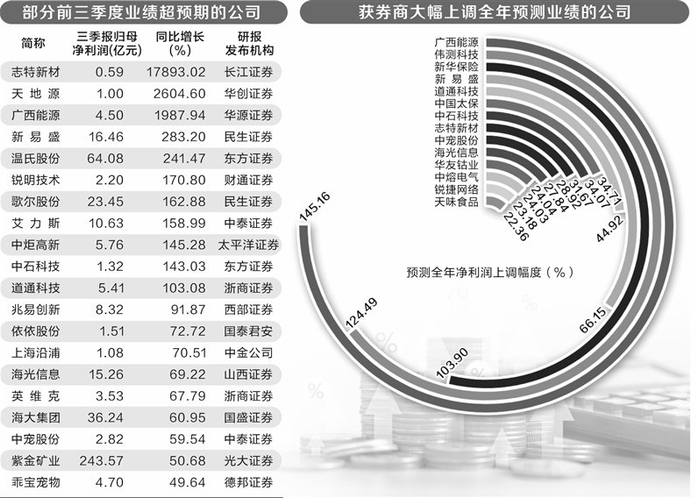 据证券时报·数据宝统计,有73家公司发布三季报后,券商给出研报认为业绩超预期,其中14家公司获券商上调2024年净利润预测幅度超20%。