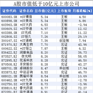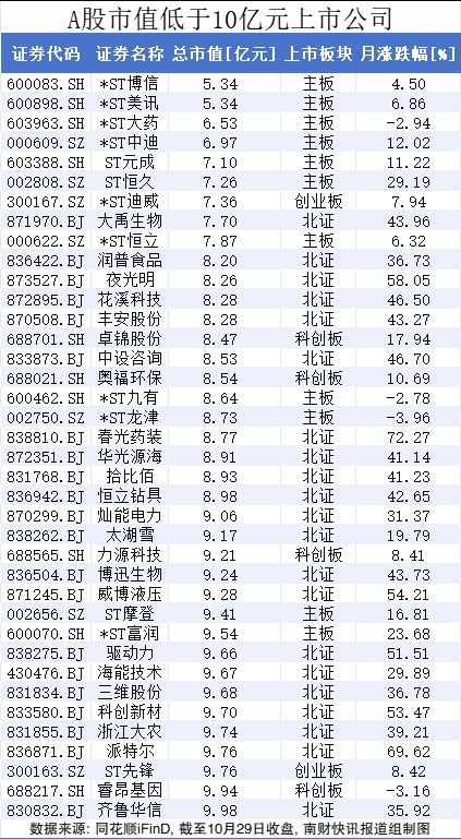 据南财快讯记者不完全统计,截至10月29日收盘,A股市值低于10亿元的上市公司合计有38家。其中北交所21家,数量最多,主板11家,科创板和创业板分别有4家和2家。