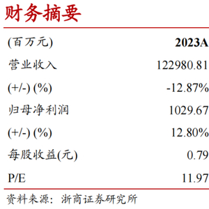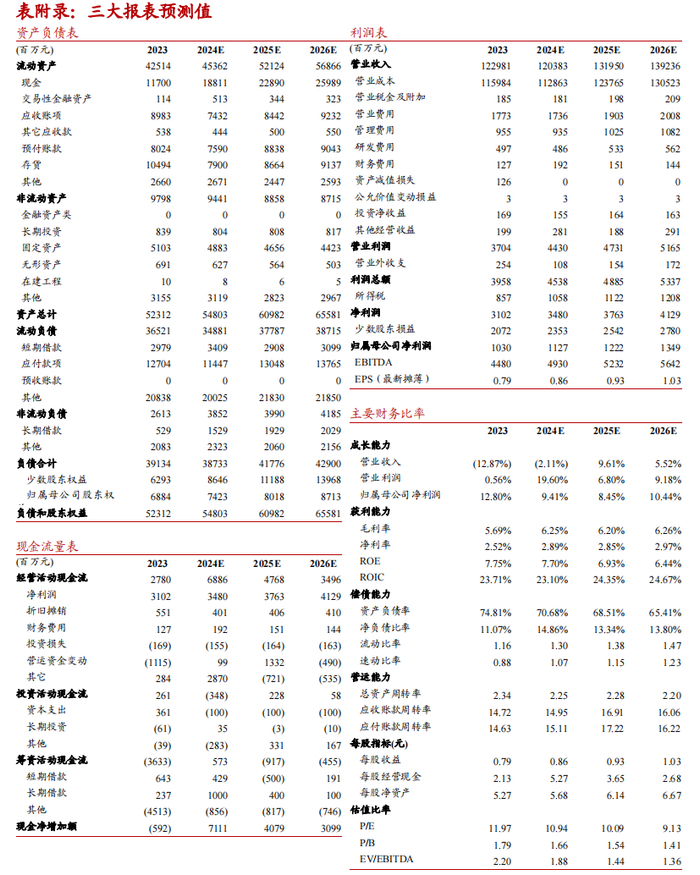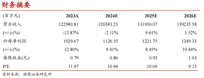 综上,预计公司2024-2026年实现营业收入1204、1320和1392亿元,同比分别-2.11%、+9.61%和+5.52%;实现归母净利润11.27、12.22和13.49亿元,同比分别+9.41%、+8.45%和+10.44%。