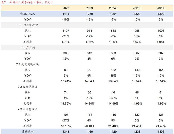 供应链运营方面:2022-2023年,受大宗商品市场需求影响,公司供应链运营业务收入同比下滑,随着宽松政策提振,预计2024-2026年需求有望逐步回升,假设2024-2026年公司供应链运营业务收入分别同比-5%、+10%和+5%,受益于公司拓展品类及结构调整,预计毛利率稳中有升,假设2024-2026年供应链运营业务毛利率分别为1.96%、1.97%和1.98%。