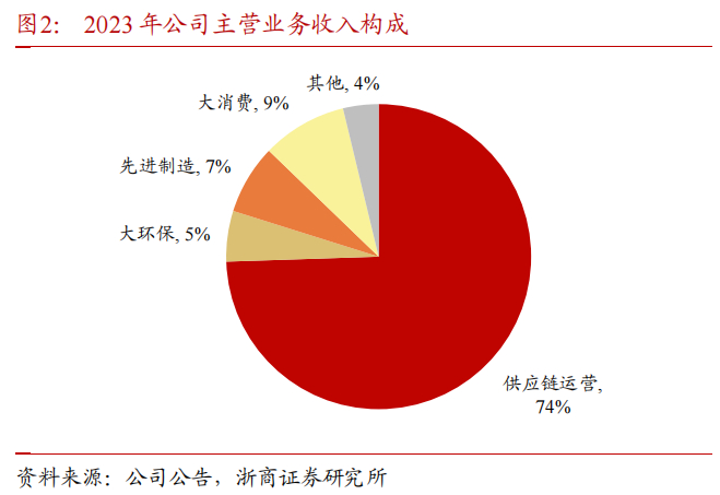 公司的主营业务包括产业链和供应链两大类,产业链包含大环保、先进制造、大消费三个板块,供应链包含大宗商品运营与机电设备进出口。2023年,供应链运营、大环保、先进制造、大消费分别占公司主营业务收入的74%、5%、7%和9%,分别占主营业务毛利的26%、16%、19%和33%。