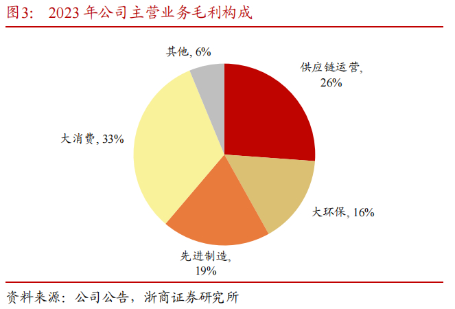 业务覆盖范围广泛,“双轮”驱动增强业务韧性。公司的主营业务包括产业链和供应链两大类,产业链分为大环保、先进制造、大消费三个板块,供应链即供应链集成服务,指大宗商品运营与机电设备进出口。2023年,供应链运营、大环保、先进制造、大消费分别占公司主营业务收入的74%、5%、7%和9%,分别占主营业务毛利的26%、16%、19%和33%。