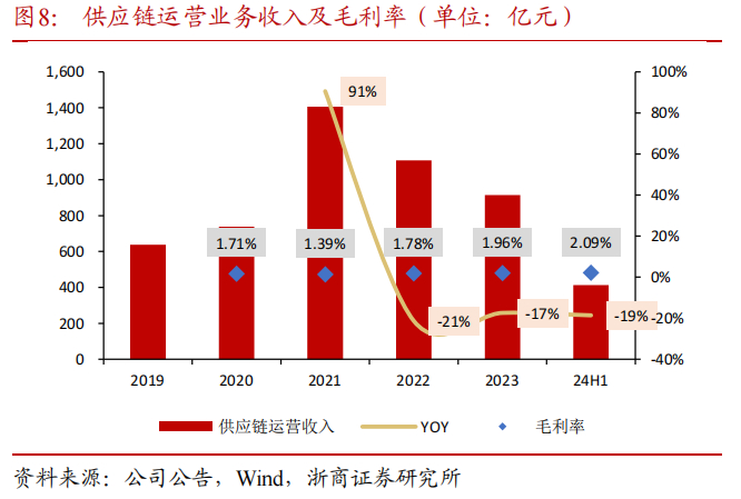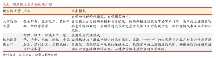 “供应链运营”包括大宗商品运营、机电设备进出口。其中,大宗商品运营主要产品包括金属矿石、能源化工、农林产品、纺织原料等,机电设备进出口主要产品包括纺织、轻工、机加工设备等。2023年,供应链运营业务占公司营业收入的74%,占公司毛利的26%。