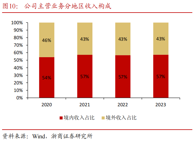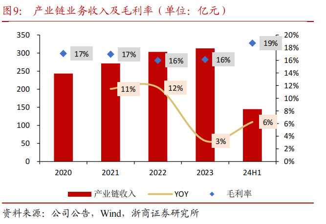 产业链业务收入稳步提升,境外业务收入占比约43%。分业务来看,供应链运营业务受大宗商品市场波动影响,2022年以来收入承压,24H1供应链运营业务实现收入413亿元,同比-19%,毛利率约2.09%;产业链业务收入逐年提升,24H1产业链收入约145亿元,同比+6%,毛利率约18.73%。2023年公司境外业务收入占比约43%。