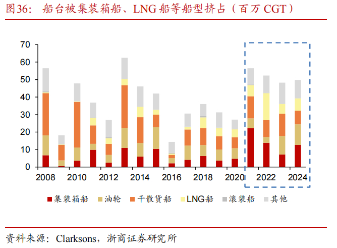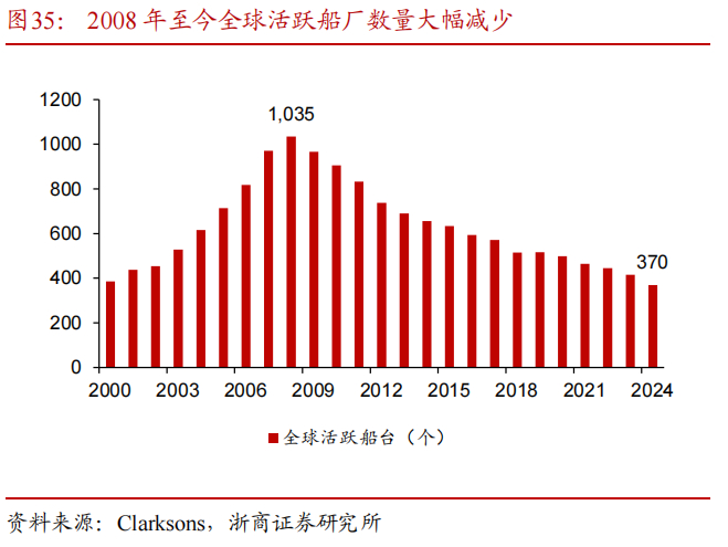 全球造船产能大出清,且船台被高附加值船型占满,船厂待价而沽。造船业十余年低迷导致全球活跃造船厂数量从 2008 年的1035 家下降至 2024 年的 370家,产能大幅收缩。此外,过去三年集运、LNG、油运市场相继火热接力带动新订单提升,使产能迅速饱和。