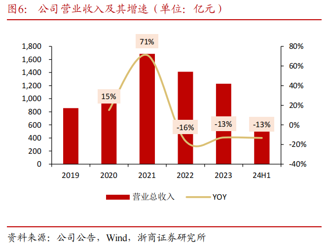 受大宗商品需求影响,公司营业收入有所波动,得益于2021年大宗商品需求及价格量价齐升,营收大幅增长,2022年至今,受大宗商品需求不足及价格回落的影响,公司营收大幅下降,公司积极优化调整产业结构,产业链板块高增下,带动利润保持稳健增长,2024年上半年,公司实现营业收入559亿元,同比-13.3%,实现归母净利润5.7亿元,同比+12.12%。