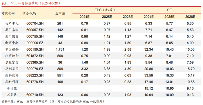 考虑到公司业务涉及行业较多,分别对供应链运营、先进制造、大环保和大消费四大业务选取可比公司,其中,供应链运营板块选取大宗商品供应链运营业务相关的物产中大、厦门象屿、厦门国贸、浙商中拓;先进制造板块选取船舶制造与航运业务相关的中国船舶、招商轮船;大消费板块选取家用纺织与品牌服饰业务相关的水星家纺、华利集团;大环保板块选取光伏与清洁能源等业务相关的晶科能源、晶科科技等作为可比公司,2024-2026年可比公司平均PE分别为15.12、10.95和9.16倍,公司PE分别为10.94、10.09和9.13倍,低于可比公司平均估值。首次覆盖,给予“增持”评级。
