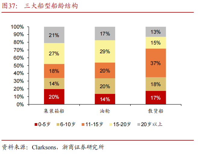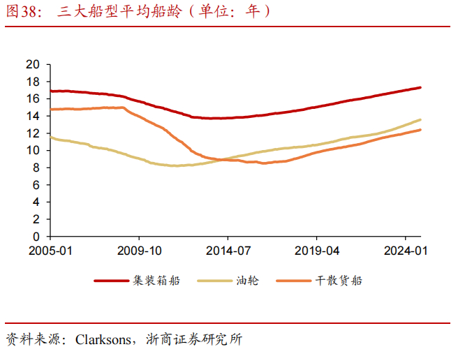 现役船队老龄化严重,有望迎来替换高峰。全行业船队平均年龄自2013年以来持续提升且处于历史较高水平,截至2024年10月,集装箱船/油轮/干散货船整体平均船龄分别为17.3、13.6、12.4岁,其中15岁以上占比分别为48%、46%、28%。按照各船级社规定,商船固定年限需要检修,同时越老的船维修保养的费用越高,船东一般在20岁后选择拆船,但考虑到当前船台紧张、交付时间拖长,若2024-2027年不下单,到2030年左右,行业新增运力将难以弥补2008年造船高峰时运力的集中退出。