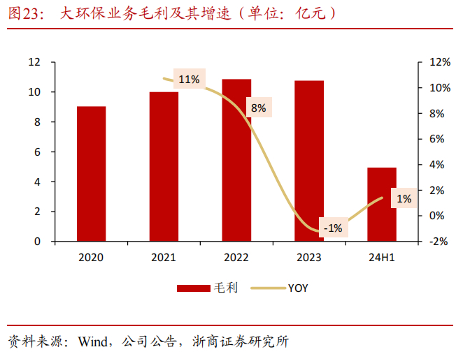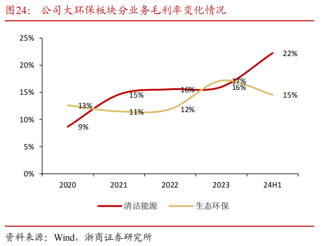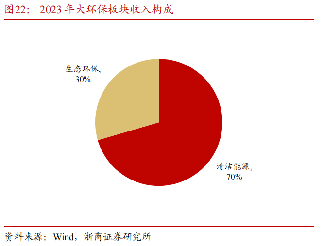 “大环保”板块主要包括清洁能源和生态环保两大业务。2023年大环保板块实现营业收入65.86亿元,同比-11.53%,其中,清洁能源业务收入占比约70%,毛利率约16.00%,生态环保业务收入占比约30%,毛利率约17.15%。大环保业务营收下降主要系组件价格承压,受益于公司积极抓住国内外工程机遇,板块在行业承压背景下依旧实现了利润增长。