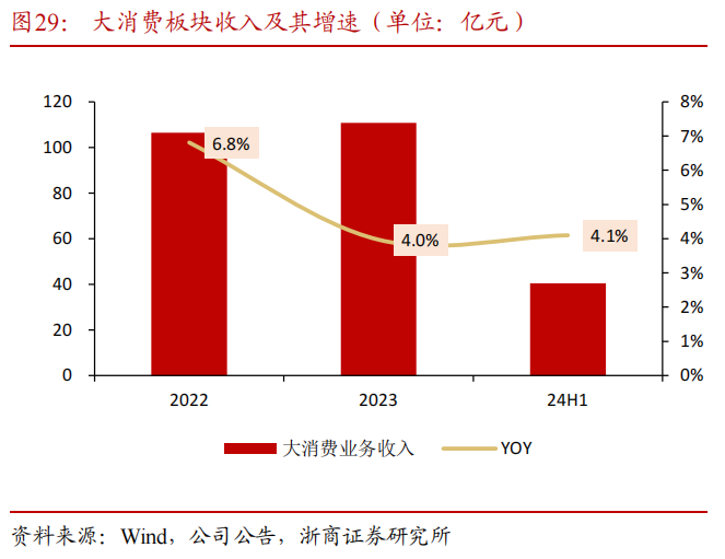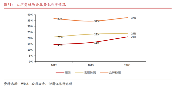 “大消费”板块主要包括服装行业、家用纺织品行业、品牌校服。2023年大消费板块实现营业收入110.75亿元,同比+3.97%,实现毛利22.26亿元,同比+15.2%,其中,服装业务收入占比约61%,毛利率约16.20%,家用纺织业务收入占比约29%,毛利率约23.33%,品牌校服收入占比约10%,毛利率约34.43%。