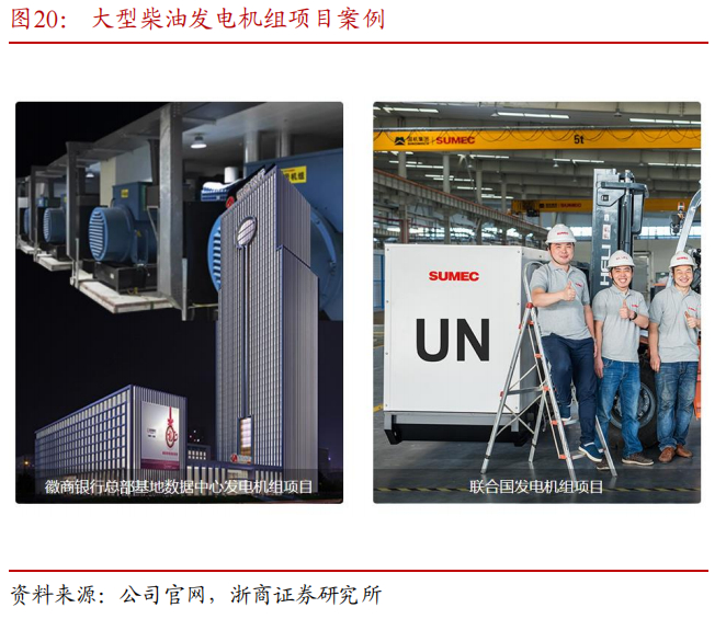 柴油发电机组属于配套工程施工(工程配套)项目使用以及备用电源,其应用场景广泛,目前该业务遍布 40 多个国家,为中国移动、中国联通、微软、京东数据中心等提供发电机组及相应服务,累计完成千余个项目。公司依托在发电机组行业近 20 年的全球产业链和供应链优势,持续强化科技创新和全流程服务能力,致力于为全球用户提供更专业、更可靠、更环保的柴油电力解决方案。