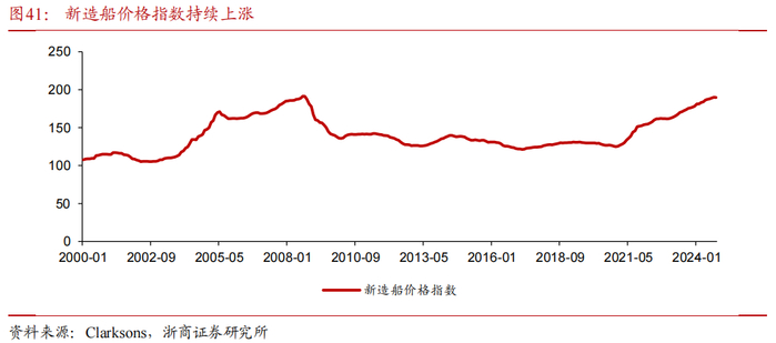 2024年以来新造船价格指数高位继续上涨,年内涨幅已达6%,较2020年11月的历史低点上涨51%,较2008年历史峰值仅1%的差距。