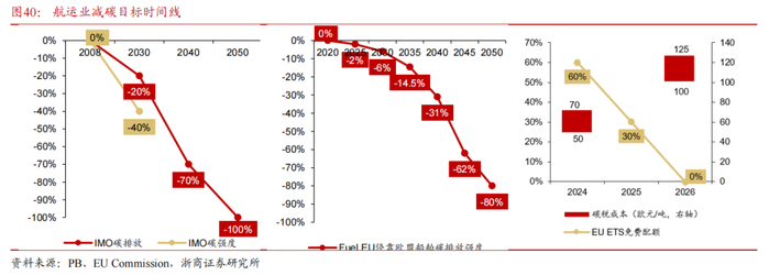 EU ETS已于2024年起开始覆盖航运业,规管欧盟境内航线碳排放。2024年给予60%的免费配额,2025-2026年免费配额逐渐退坡至30%、0%。目前碳税成本为50-70欧美元/吨CO2,到2026年将上涨至100-125欧元/吨CO2。