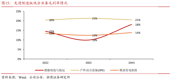 “先进制造”板块主要包括户外动力设备、柴油发电机组、船舶制造与航运。2023年公司先进制造板块实现营业收入90.37亿元,同比+8.15%,其中,户外动力设备(OPE)收入占比约38%,毛利率约21.37%,船舶制造与航运业务收入占比约49%,毛利率约9.94%,柴油发电机组收入占比约12%,毛利率约12.43%。