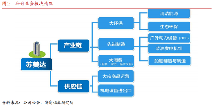 公司产业链板块包括三大业务,分别是大环保、先进制造、大消费,涉及的细分行业包括清洁能源、生态环保、户外动力设备、柴油发电机组、船舶制造与航运、纺织服装等。2023年,公司大环保、先进制造、大消费分别占营业收入的5%、7%和9%,占毛利的16%、19%和33%。