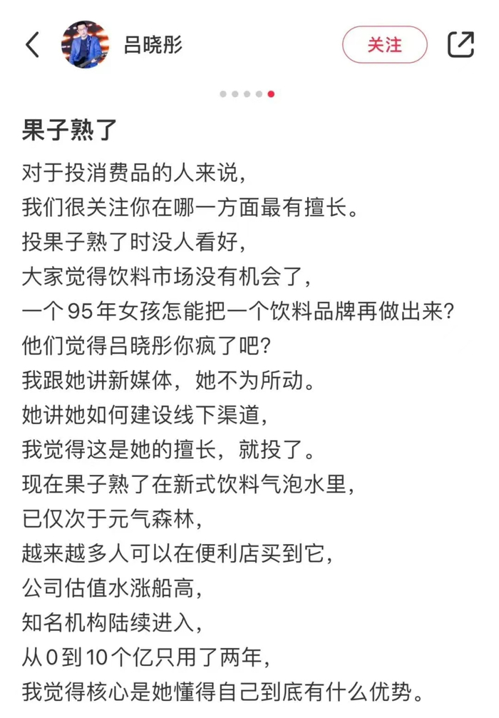 参投果子熟了的微木资本创始人兼CEO吕晓彤曾于2023年在其小红书个人账号上表示,“现在果子熟了在新式饮料气泡水里,已仅次于元气森林。”
