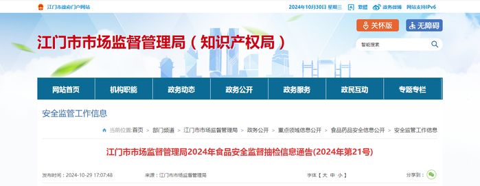 广东省江门市市场监督管理局2024年食品安全监督抽检信息通告(2024年第21号)