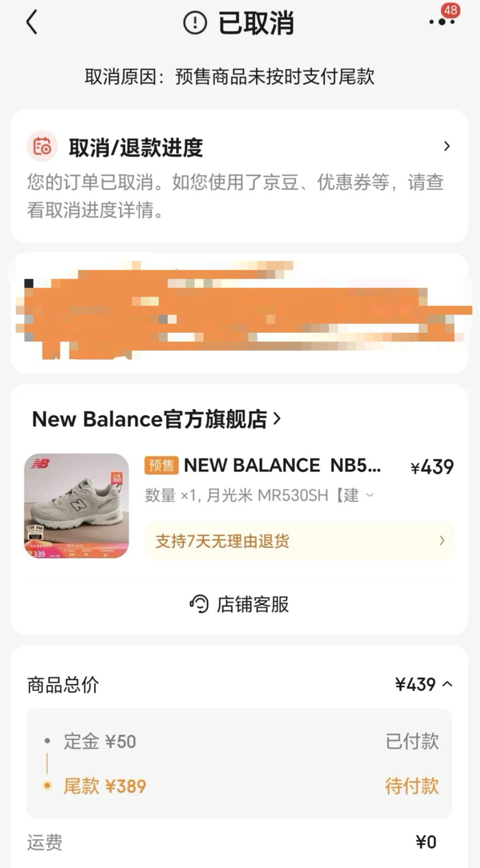 京东部分商户付尾款的时间限制在28小时内,用户超时被扣50元定金