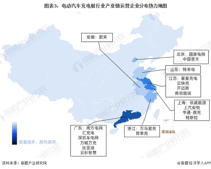 从我国电动汽车充电桩产业链企业区域分布来看,电动汽车充电桩行业产业链运营企业主要分布在华南和华东沿海地区,其中广东为主要聚集地,其次是江苏、上海、浙江以及北京。此外,山东、安徽等省份也有较多电动汽车充电桩企业分布。