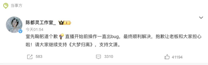 凌晨,陈都灵工作室发文道歉并解释原因:直播开始前操作一直出bug,最终已经顺利解决。