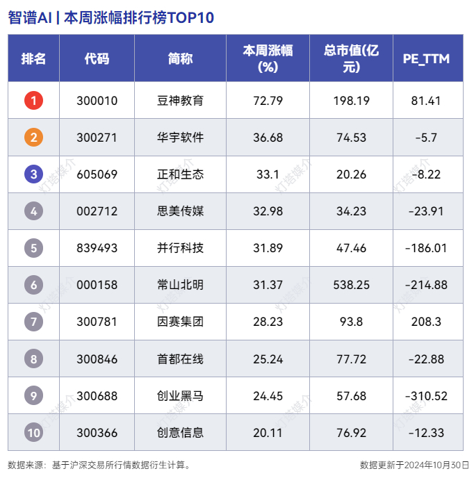 10月30日,智谱AI概念股延续涨势,豆神教育20CM三连板,正和生态(605069)、思美传媒(002712)3连板,并行科技(839493)涨超10%,平治信息(300571)、首都在线(300846)、凌云光(688400)等开盘后快速冲高。