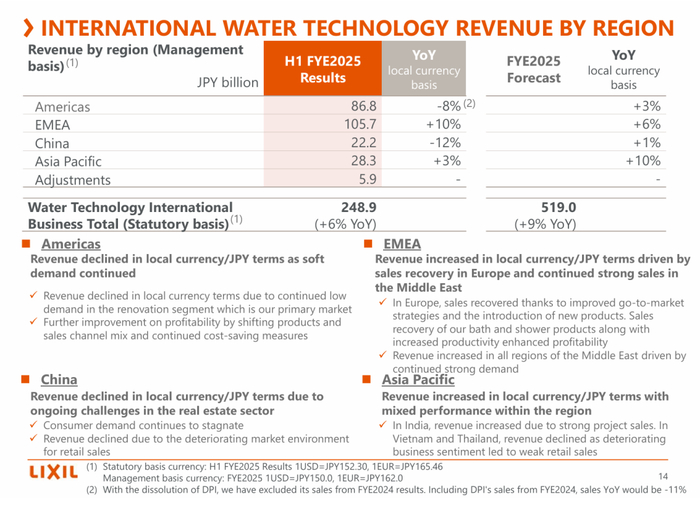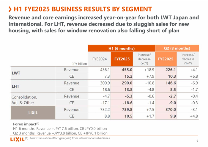 分业务看,LWT(水科技业务)4-9月销售额4550亿日元(约合人民币222.34亿元),较上年同期增加189亿日元;营业利润152亿日元(约合人民币7.43亿元),增加79亿日元。LHT(住宅科技业务)销售额2900亿日元(约合人民币141.71亿元),营业利润138亿日元。
