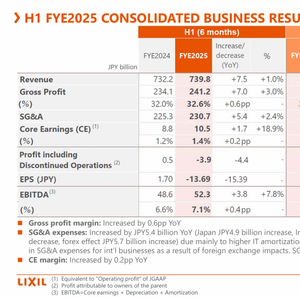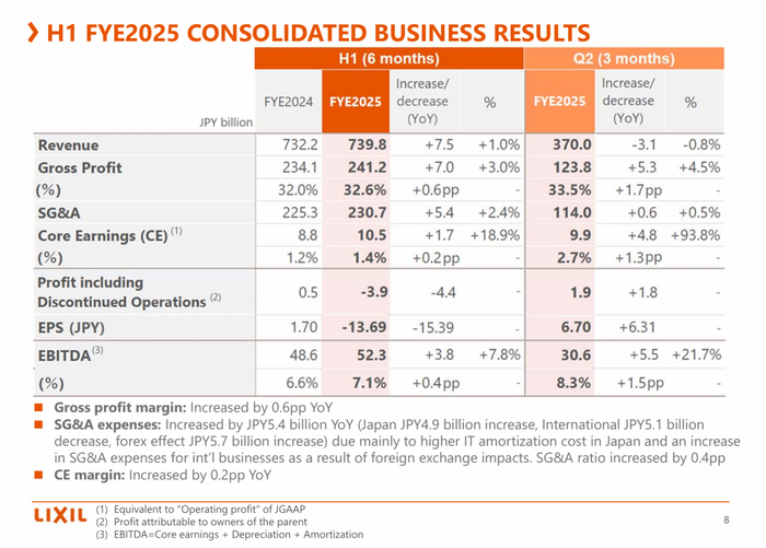 据骊住发布的半年度报告,该公司4-9月销售额为7398亿日元(约合人民币361.50亿元),同比增长1.0%。利润方面,营业利润99亿日元,同比增长49.0%;EBITDA(息税折旧摊销前利润)523亿日元,同比增长7.8%。