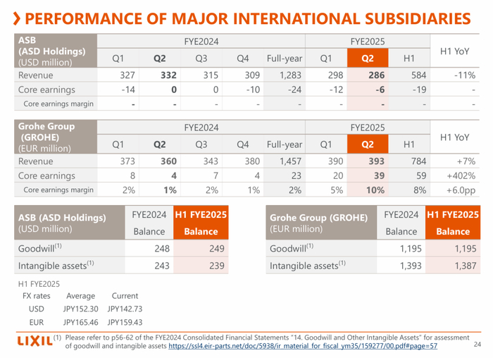 10月30日,骊住集团发布2024财年(2024年4月至2025年3月)上半财年报告。2024年4-9月,骊住集团实现销售额7398亿日元(约合人民币361.50亿元,以9月底汇率计算,下同),同比增长1.0%;营业利润99亿日元,同比增长49.0%。作为骊住旗下主要海外子公司,高仪集团(Grohe Group)、美标(ASB)分别取得销售额7.84亿欧元(约合人民币61.27亿元)和5.84亿美元(约合人民币40.99亿元),高仪的收益大幅好转,营业利润增幅达到402%。