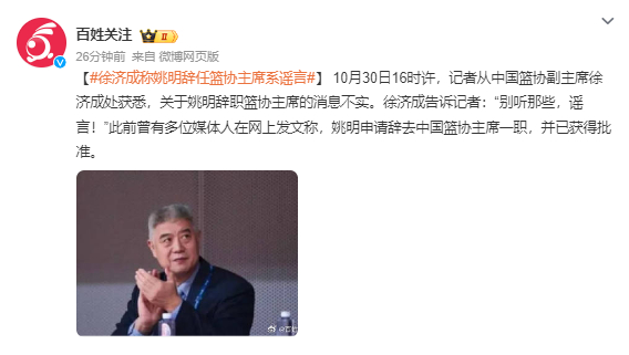 篮协副主席徐济成:姚明辞任篮协主席系谣言
