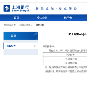 昨日,上海银行在官网发布了《关于调整人民币一天/七天个人通知存款产品利率的公告》。