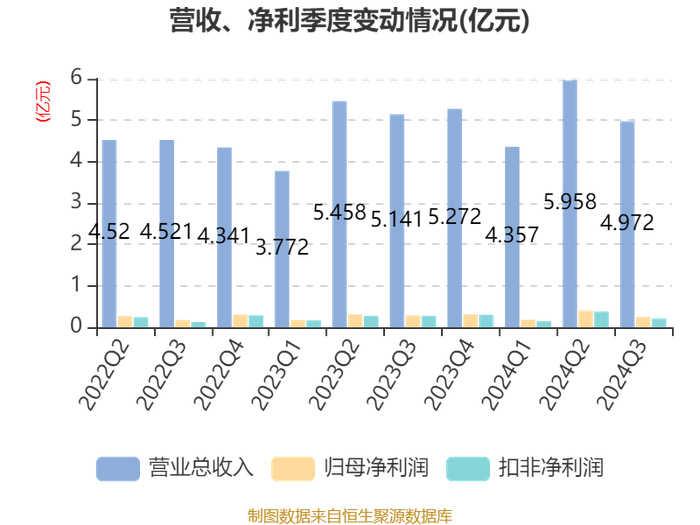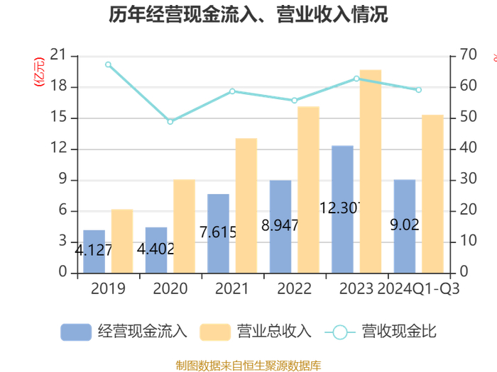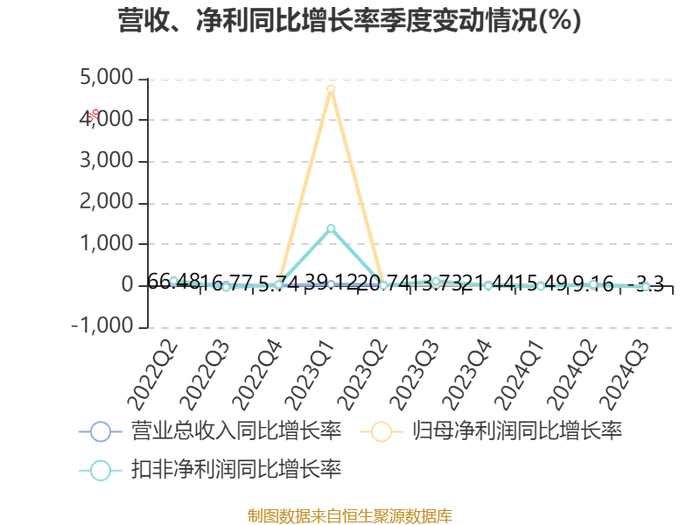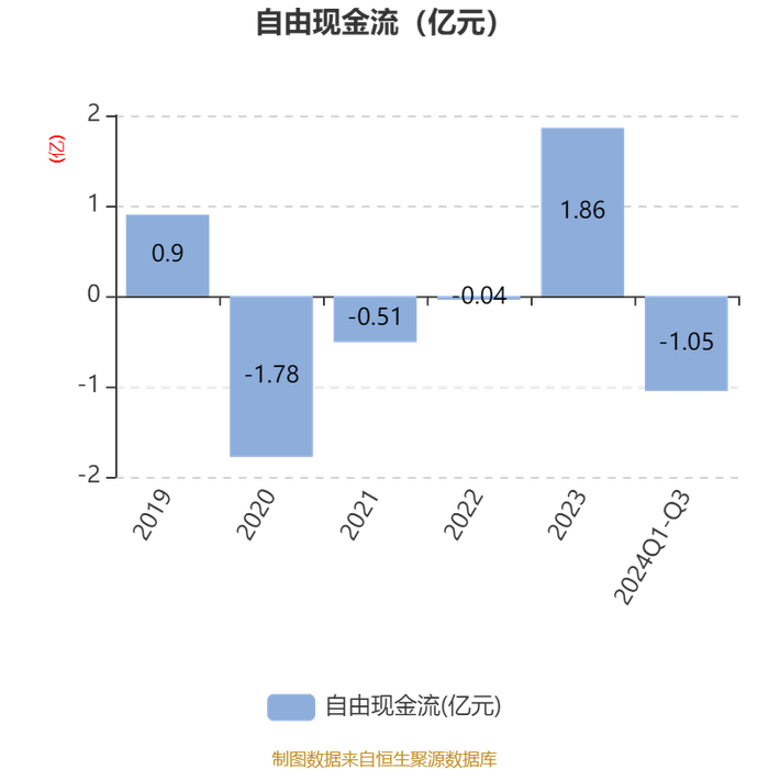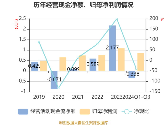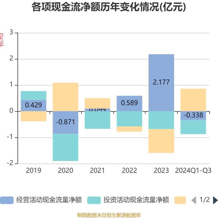 2024年前三季度,公司经营活动现金流净额为-3378.09万元,同比减少5370.34万元;筹资活动现金流净额8598.69万元,同比增加1.03亿元;投资活动现金流净额-5399.19万元,上年同期为-5752.04万元。