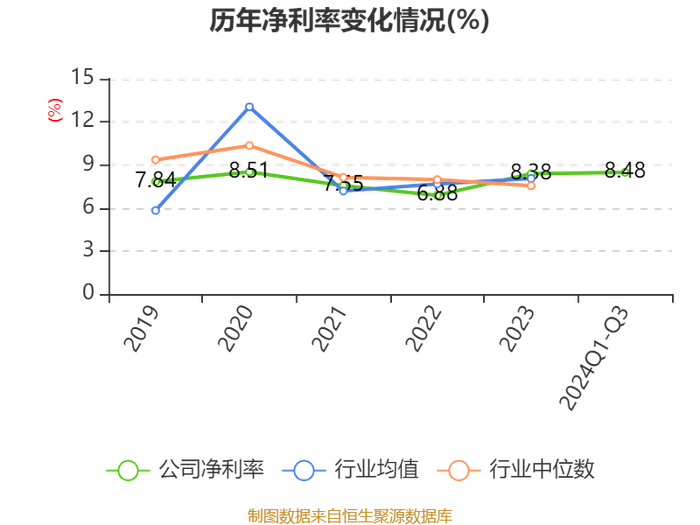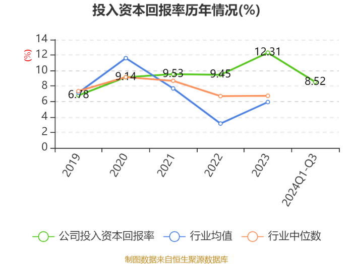 盈利能力方面, 2024年前三季度公司加权平均净资产收益率为8.61%,同比下降0.18个百分点。公司2024年前三季度投入资本回报率为8.52%,较上年同期下降0.94个百分点。
