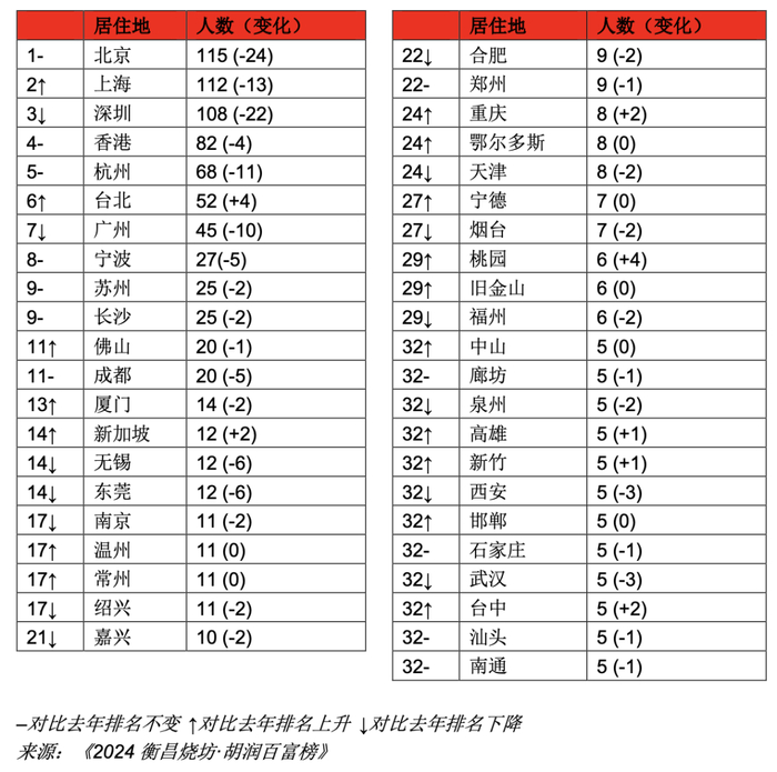 上海超越深圳,以112位位列第二,比去年减少13位;占总人数的10.2%;财富总和近1.9万亿元,占总财富的9%。