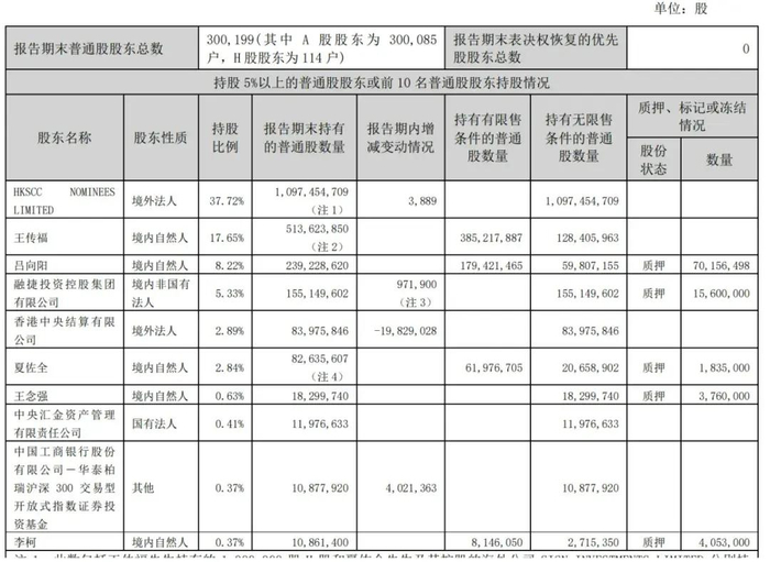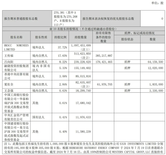 截至2024年6月30日,HKSCC NOMINEES LIMITED持股为37.72%,王传福直接持股为17.65%,吕向阳持股为8.22%;
