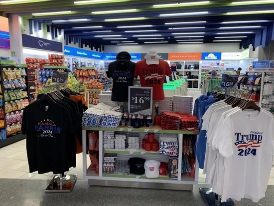 在拉斯维加斯的特朗普大厦甚至当地机场开设的Trump Store,专门出售特朗普的周边商品。而在民主党占优的加利福尼亚州洛杉矶,二人的周边商品常常同时出现,但不同的是,哈里斯的商品在这里更受关注。