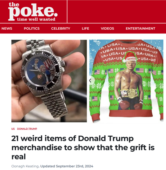美国网站Poke干脆列出“21件奇怪的特朗普周边”,并写道:“你不能指望特朗普来支付账单,忠于他的妻子,说真话,执行他承诺实施的政策,或者打一场公平的高尔夫球。但可以确定,如果他能以最小的努力快速赚钱,他会立即采取行动。